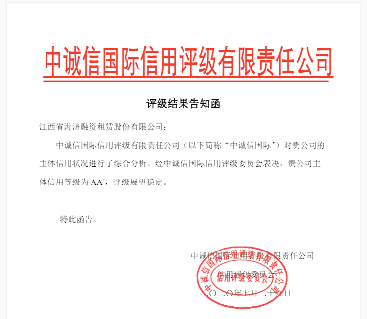?? ? ??2020年7月29日,經(jīng)國內(nèi)權(quán)威評(píng)級(jí)機(jī)構(gòu)中誠信國際信用評(píng)級(jí)有限責(zé)任公司評(píng)定,江西省海濟(jì)融資租賃股份有限公司(以下簡稱海濟(jì)租賃)首獲AA-主體信用評(píng)級(jí),評(píng)級(jí)展望為穩(wěn)定。海濟(jì)租賃成立于1985年,是江西省首家融資租賃公司,近年來公司在融資租賃、供應(yīng)鏈金融、商業(yè)保理等領(lǐng)域持續(xù)發(fā)力,為實(shí)體經(jīng)濟(jì)提供專業(yè)化金融服務(wù),累計(jì)投放金額數(shù)十億元。本次評(píng)級(jí)結(jié)果體現(xiàn)了資本市場對(duì)海濟(jì)租賃資信水平、發(fā)展前景的充分肯定,對(duì)公司進(jìn)一步增強(qiáng)市場議價(jià)能力、降低融資成本,拓展直接融資渠道具有積極意義。